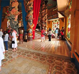 Cách thị xã Tây Ninh khoảng 5km về hướng Đông Nam, Tòa thánh Tây Ninh nổi bật trong khuôn viên rộng hơn 1km với nét kiến trúc riêng. Bên trong tòa thánh gồm hai hàng cột rồng, sơn xanh, đỏ, trắng rực. Trên trần nhà là 9 khoảng bầu trời mây và sao. Khu chính điện thờ Thiên Nhãn nằm trên quả càn khôn.